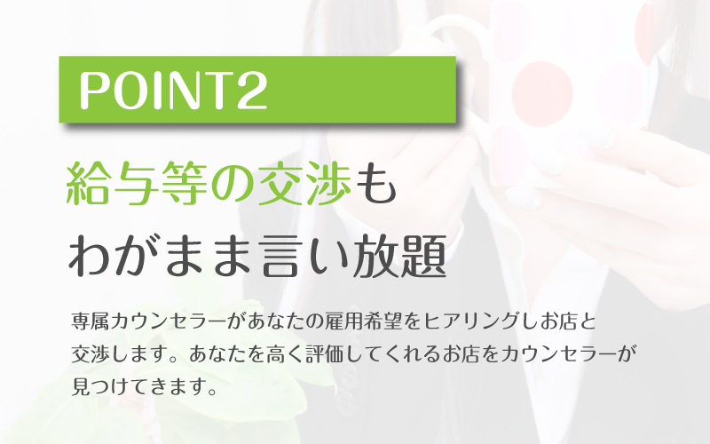 今のお店より好条件で移籍したいけど言いづらい部分を、プラスワンのカウンセラーさんが代わりにやり取りしてくれて助かりました。